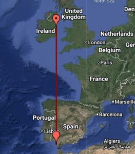 (Map highlighting the distance travelled of a fledgling Common Tern, from Dublin Port to Cadíz, Spain.)