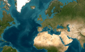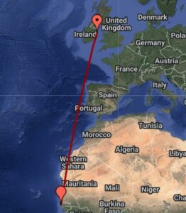 (Map highlighting the distance travelled of a fledgling Common Tern, from Dublin Port to Kartong Bird Observatory, The Gambia.)