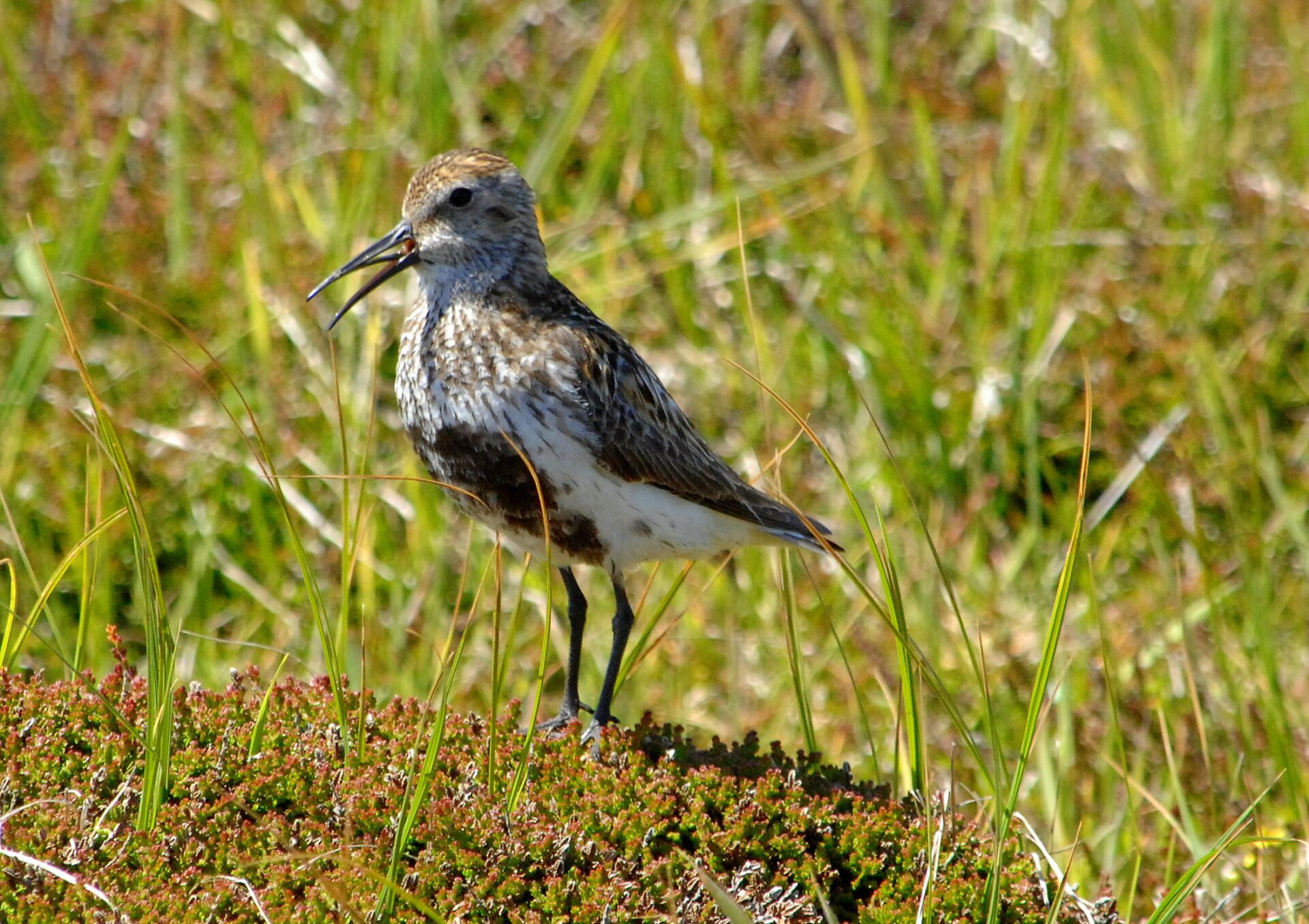 One of the smaller waders and our most abundant one in winter and on passage. A limited number breed in some sandy / grassy locations along the west and north coasts. Plumage is highly variable - in summer, rich chestnut above, streaked on breast, white below with a striking black patch on the belly. The more usually encountered winter plumage bird shows a rather non-descript, uniform, plain brownish-grey on all upperparts and cold white underparts. Juveniles in autumn have warm brown tones on the upperparts and considerable streaking on the breast and underparts. There are many other variations and combinations, depending on the bird's state of moult. It is a rather dumpy bird, with black legs and a longish bill which downcurves slightly. Often occurs in very large flocks. An important bird to get to know (in all its plumages) if you want to successfully identify other similar-sized waders.