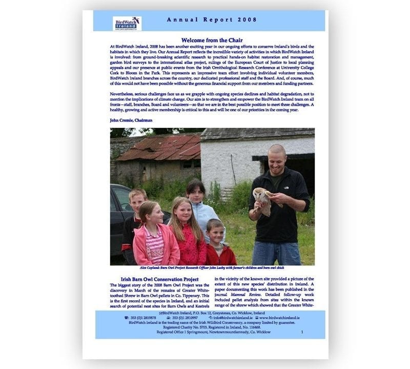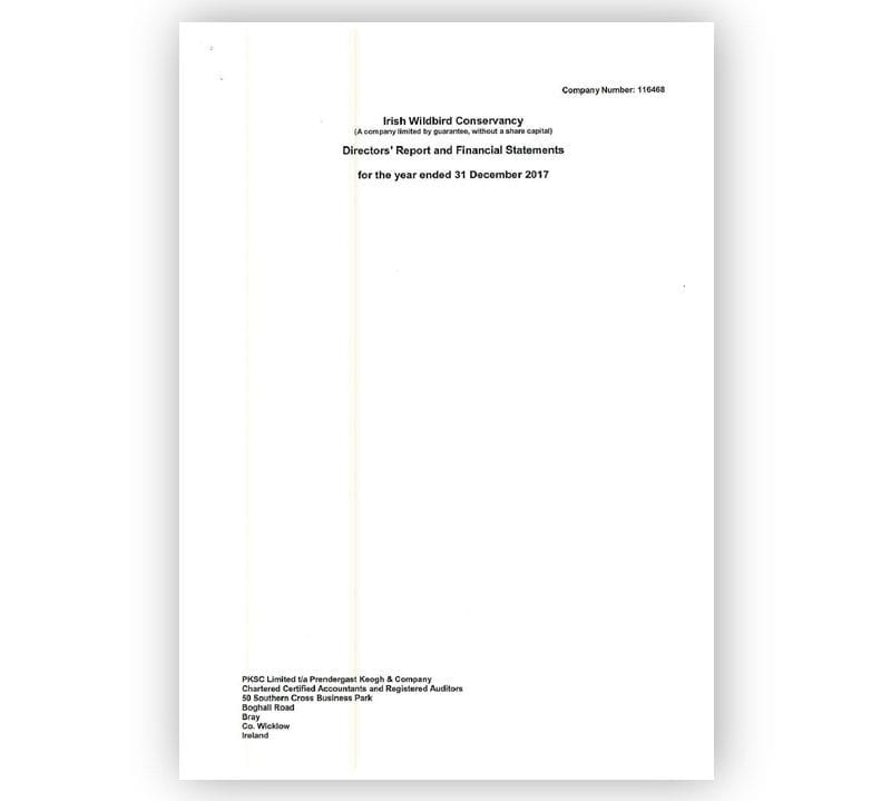 Irish Wildbird Conservancy (trading as BirdWatch Ireland) is a company limited by guarantee, registered in Ireland : CRO No. 116468